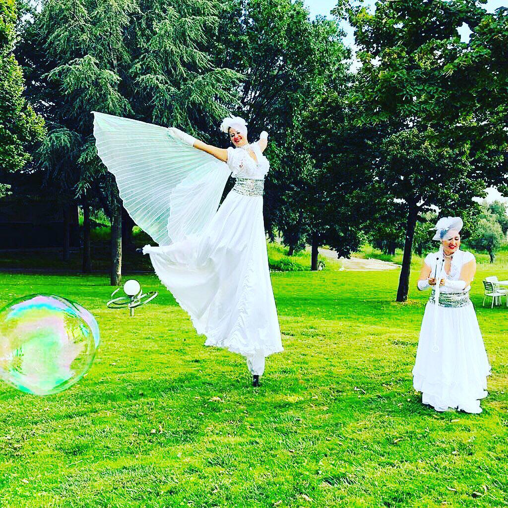 1 artista realizza 2 spettacoli: 1 di danza su trampoli + 1 a scelta tra danza con fuoco, water ball, giocoleria, bolle di sapone giganti.